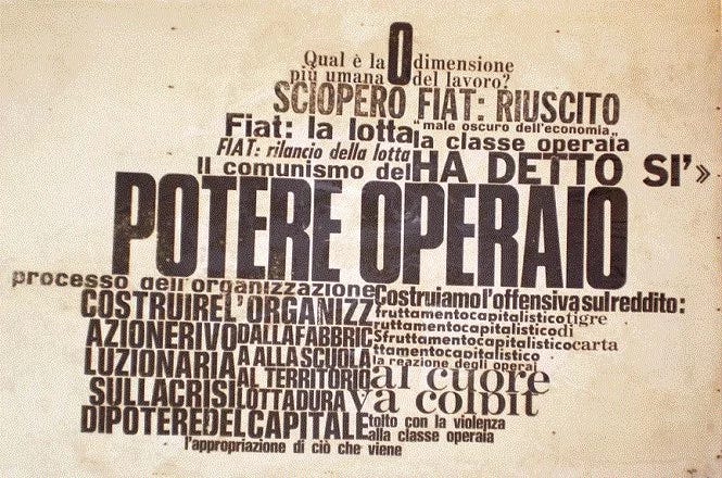 A intensa aceleração do “milagre Italiano” fez com que o choque da sujeição ao tempo e espaço da grande fábrica fosse particularmente óbvio e brutal. Todas as identidades socioeconómicas - o ser “operário”, o ser “desempregado”, o ser “mulher”, o ser “jovem”, o ser “marginal” – revelavam ser apenas categorias do confronto entre o domínio capitalista e um antagonismo de classe de rastilho curto. A resposta seria também “imediata”. “Queremos Tudo”, como dizia o próprio Balestrini. A contestação recusava toda a mediação social - sindicatos, partidos, etc – opondo-lhes então esse arquipélago de recusas: a dita “área da autonomia”. Não a “autonomia” da autogestão do capitalismo, mas a “autonomia” da recusa de todo o processo produtivo[3].